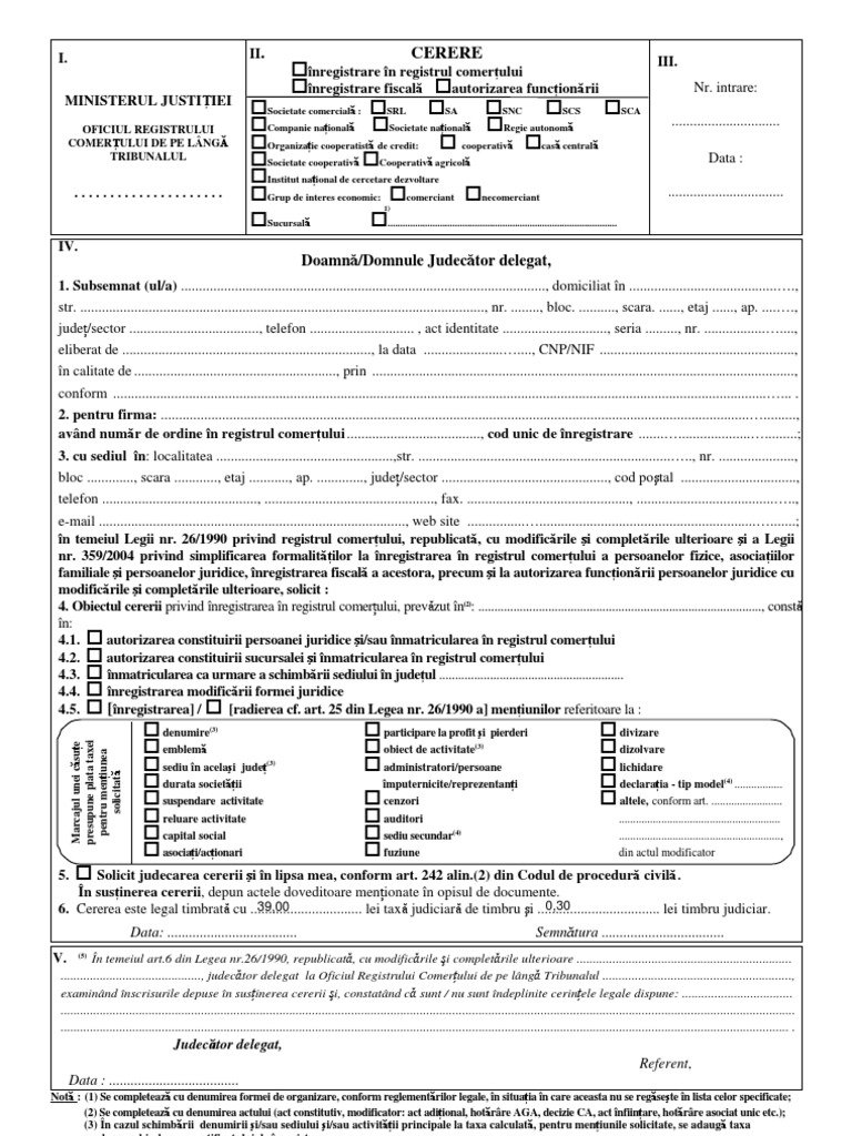 Http Www Avocat Firme Info Wp Content Uploads 2013 03 Cerere De Inregistrare Numire Lichidator L 311 990 Pdf Source from : 2 Astfel, directorul va avea competenta de solutionare a cererilor de inregistrare in registrul comertului. 26/1990 (privind registrul comertului) stabileste care acte si fapte sunt obligatoriu a fi mentionate in registrul comertului. Download as pdf, txt or read online from scribd. Cerere de inregistrare pfa ( persoane fizice, intreprinderi familiale, intreprinderi individuale ) in registrul comertuluifree download ( descarca gratis ) formulare. Indiferent ca vorbim despre prima stabilire a sediului social al unei societati sau.