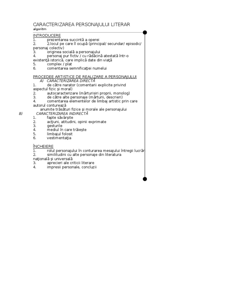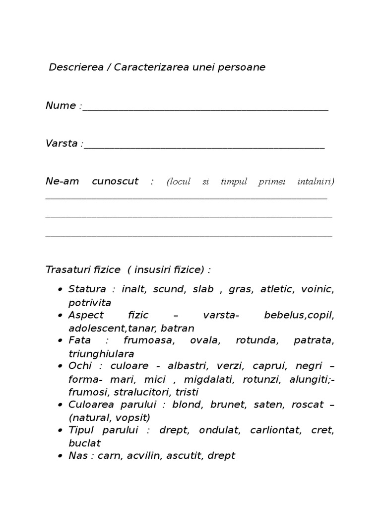 Caracterizarea de o persoană în termeni de temperament. Caracterizarea personajului este un tip de compunere (eseu) care are la bază textul literar și care tratează trăsăturile morale și fizice ale personajul literar reprezintă o instanță / o entitate prezentă în textul literar (narativ sau dramatic), produs al imaginației auctoriale (a. Care sunt modalitățile diferite de a descrie oamenii?