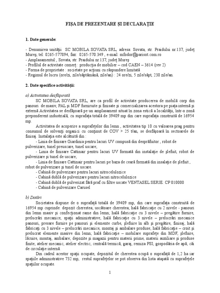 vizitati articolul complet aici : https://ro.scribd.com/doc/305464951/Fisa-de-Prezentare-Si-Declaratie Cererea pentru eliberarea autorizatiei de mediu; La baza intocmirii fişa de prezentare si declaraţie, a fost intocmita conform anexei nr.2 a: Autorizația de mediu este un act administrativ prin care se stabilesc condițiile și parametrii de funcționare a unei activități cu posibil impact semnificativ asupra acest dosar trebuie să conțină minim următoarele documente: