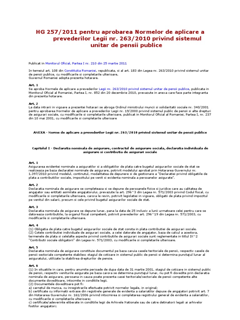 Legea pensiilor 263 /2010 ( actualizata) 01.ian.2017. H g nr 257 din 2011 norme de aplicare a legii pensiilor 263 din 2010. 263/2010 privind sistemul unitar de pensii publice, cu modificările şi completările ulterioare, guvernul româniei adoptă prezenta hotărâre.