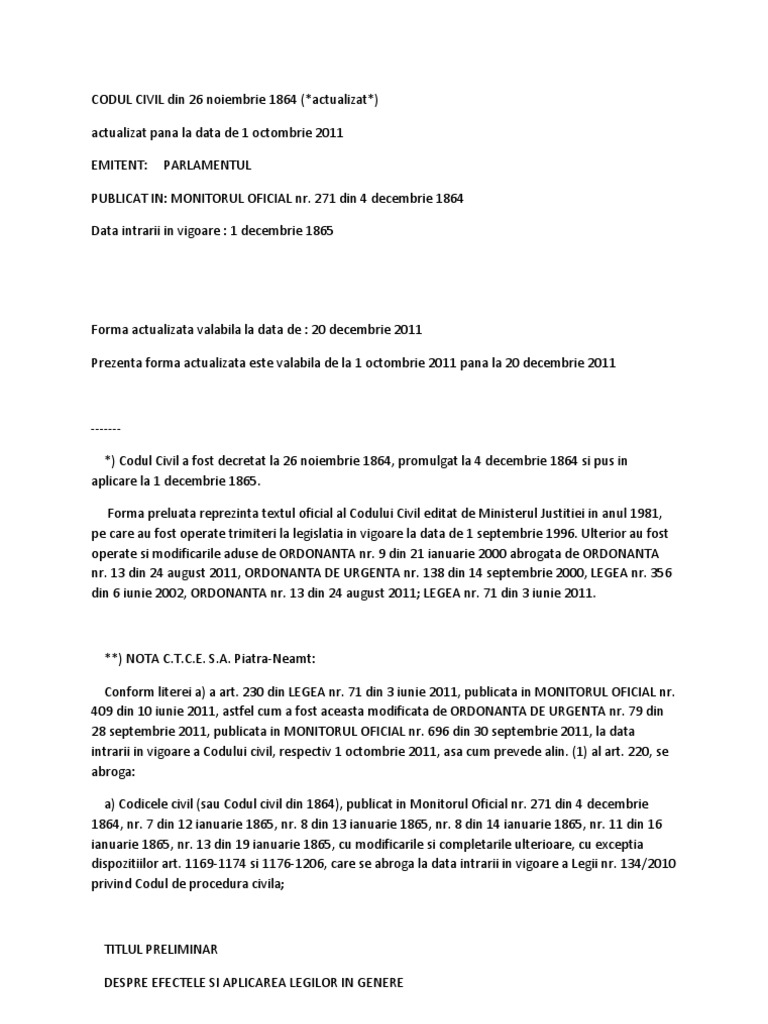 Din 2011, prescripţiile, decăderile şi uzucapiunile începute şi neîmplinite la data intrării în vigoare a legii noi sunt în întregime supuse. Aceasta republicare cu o noua renumerotare a articolelor. 1 din decretul 167/1958) și au fost reclamate în cel mult 6 luni din momentul descoperirii lor (art.
